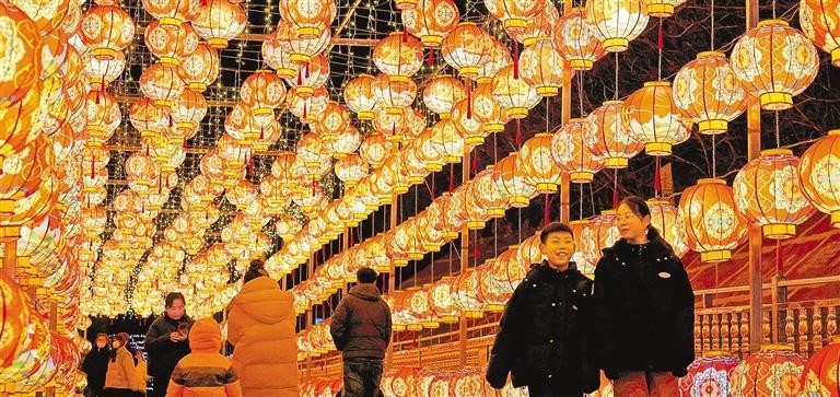 2月9日晚,人们在山东枣庄市中兴国家矿山公园赏灯游玩。孙中喆 摄(中经视觉)