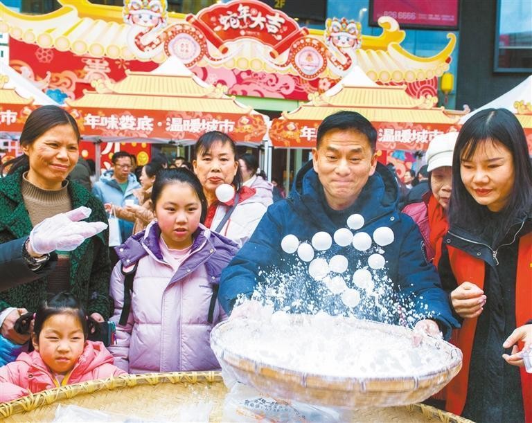2月9日,市民在湖南娄底市万豪城市广场元宵灯谜喜乐会体验摇元宵。吴永华 摄(中经视觉)