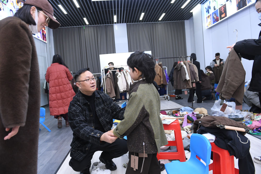 2024年1月17日,在位于浙江省湖州市织里镇的万顺服饰股份有限公司,工作人员(前左二)在品牌的2024秋季新品审版会后台和小模特交流。织里镇是中国最大的童装产业集群地,聚集着1.4万家童装企业。新华社记者 翁忻旸 摄