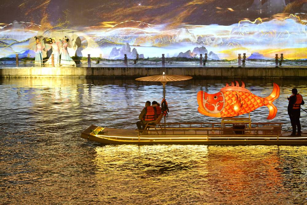 游客乘坐竹筏在湖北省宣恩县贡水河上观看河岸实景歌舞表演(2024年2月20日摄)。春节期间,当地组织丰富多彩的文化活动,吸引大批游客前来赏景游玩,为山乡经济注入活动。