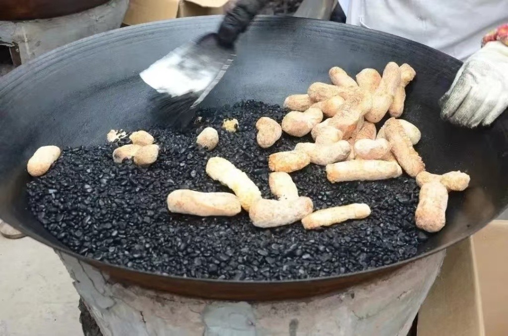 砂炒果果,顾名思义,就是用金沙江边的粗砂石混在果果里炒制,因砂石能长时间保持均匀高温,可以让果果在翻炒过程中受热更加均匀。果果炒好后,裹上熬制的糖浆,再撒上阴米子、芝麻、苏麻等香料,一道传统的砂炒果果就大功告成了。刚出锅的果果香飘十里,咬上一口,外香内甜,先脆后糯,一旦尝过,便难以忘怀,成为心头那份难以割舍的小确幸。