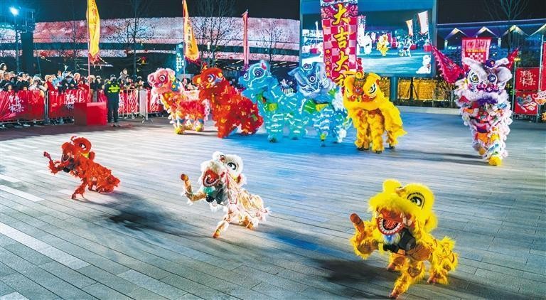 2月10日,为喜迎元宵佳节,机械狗舞狮亮相江苏苏州市狮山文化广场,科技与传统碰撞,吸引众多市民游客前来观看。张锋 摄(中经视觉)