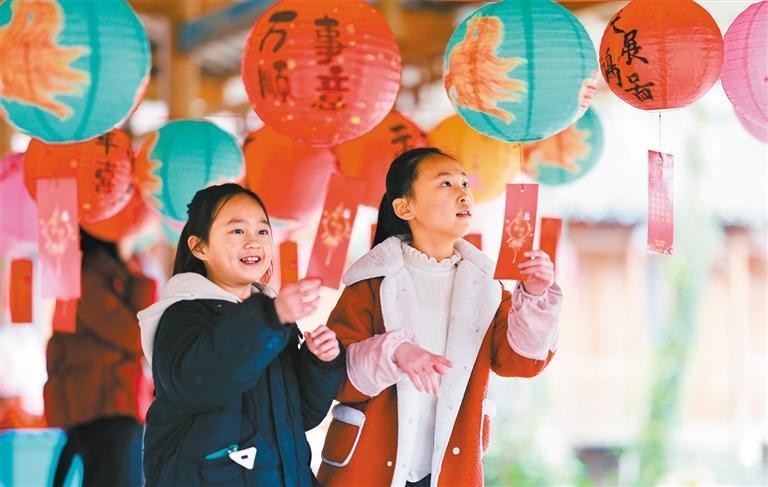 2月10日,广西桂林市灵川县兰田瑶族乡西江寨,小朋友在猜灯谜。刘教清 摄(中经视觉)