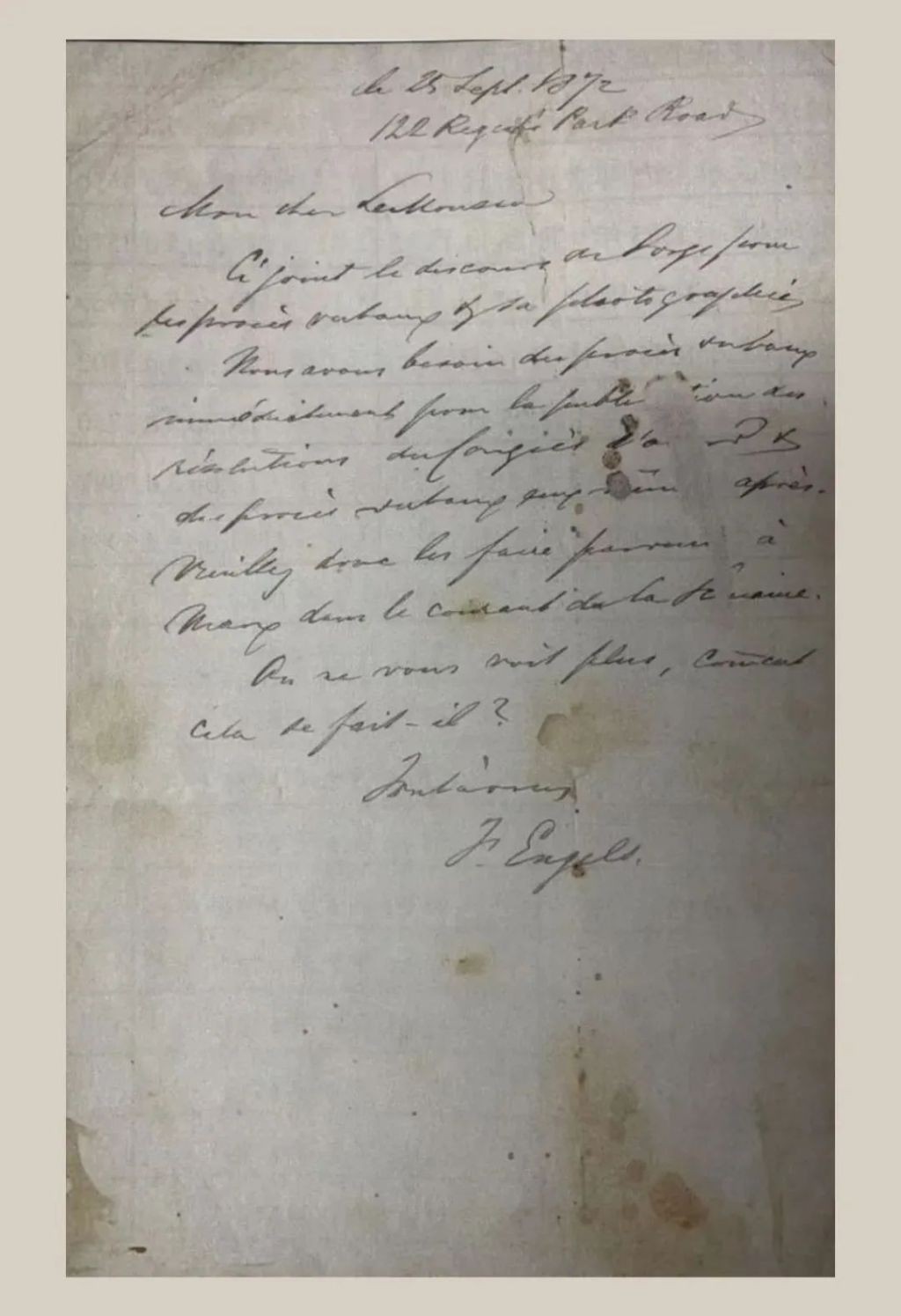 “恩格斯1872年致本杰明·勒穆修的书信”手稿。