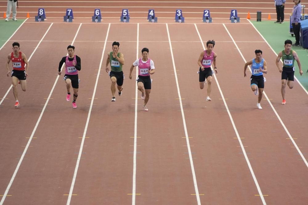 2月18日,苏炳添(中)、石雨豪(左三)、陈冠锋(左二)在比赛中。新华社发(李傲秋 摄)