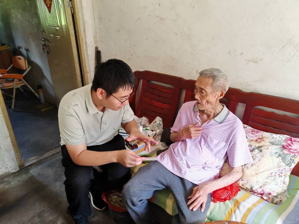 施海杰(左)在困难群众家走访。(肖屋村村委会 供图)