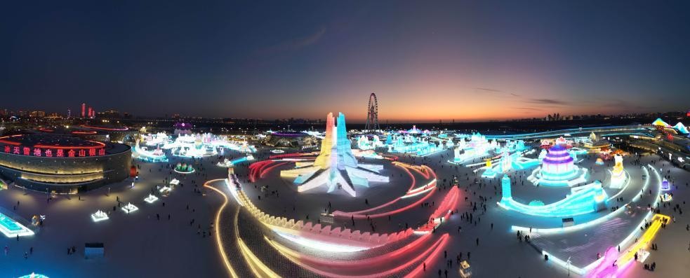 2月26日,游客在哈尔滨冰雪大世界园区游玩(无人机全景照片)。新华社发(刘洋 摄)