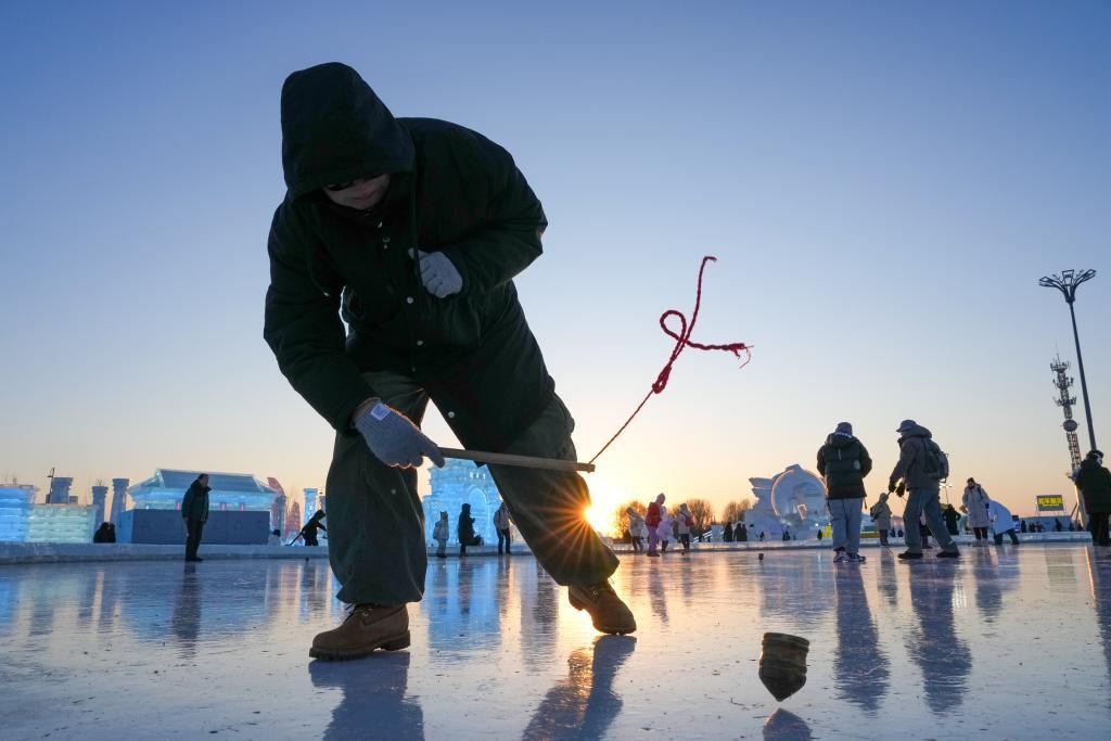 2月26日,游客在哈尔滨冰雪大世界园区内抽冰尜。新华社记者 王建威 摄
