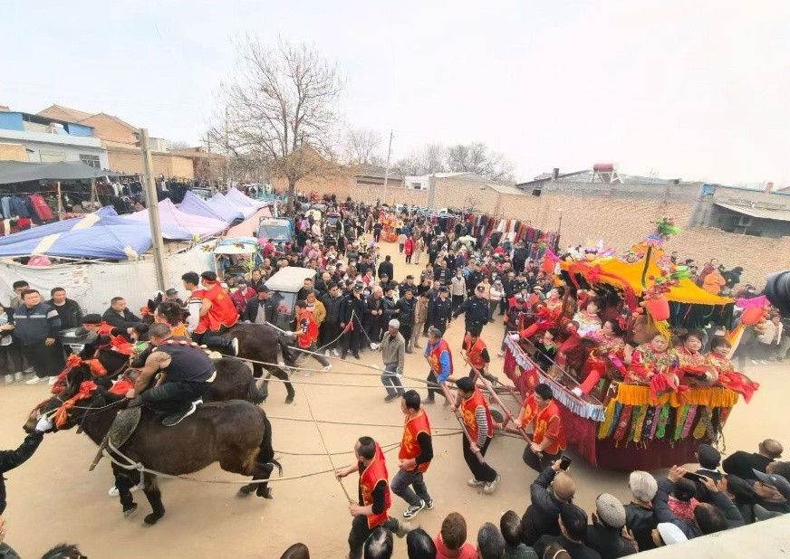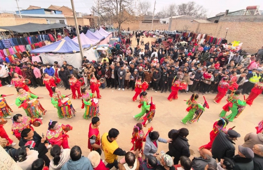 农历二月二,是陕西省渭南市大荔县阿寿村的传统庙会日。今年的庙会尤为精彩热闹,因为这是“春节”申遗成功后的首个阿寿庙会。这次活动非遗节目唱主角,灵动欢快的花苫鼓、粗犷豪放的跑骡车、栩栩如生的面花……燃爆了庙会现场,吸引了十里八乡的群众和外地游客慕名打卡观赏。