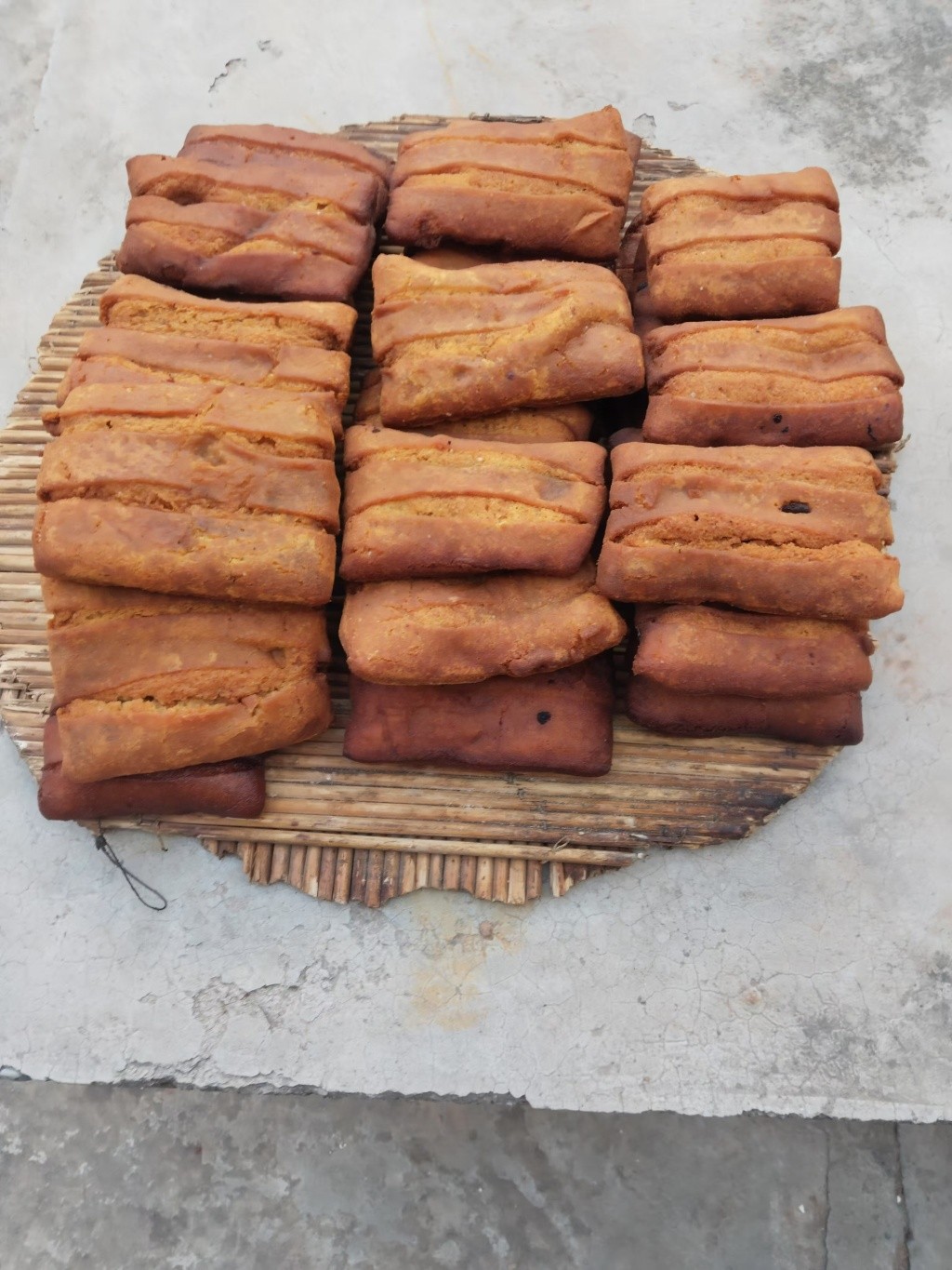 甜麻糖类似于油条的形状,但没那么细长,吃到嘴里酥软柔嫩,也是我喜欢的“油货”之一。母亲提前买好了麦芽糖熬制的糖稀,请村里开过食堂的一位长辈来帮助调和,兑入水和少许白糖稀释,然后放入面粉,用擀面杖使劲搅拌,再揉成软硬适宜的面团,擀成一块块长条状,用竹片在面块中间轻轻压出一道条痕后再下油锅炸,等到面块呈酱红色时就算熟了。甜麻糖出锅后,母亲总是让我喊来对门的邻居过来品尝,她们一边交流,一边品评麻糖的成色和甜度,母亲也总是在邻居的一通夸赞中,脸上乐开了花。