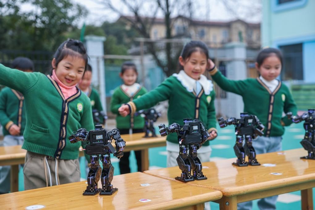 2025年2月19日,浙江诸暨市暨南街道南悦幼儿园的孩子们在拓展课程上观看机器人舞蹈。新华社记者 徐昱 摄