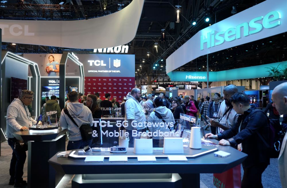 2024年1月11日,人们在美国拉斯维加斯消费电子展上参观TCL公司(左)和海信公司(右)展台。新华社记者 吴晓凌 摄