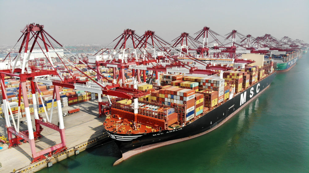 货轮在山东港口青岛港装卸集装箱(2024年3月13日摄,无人机照片)。