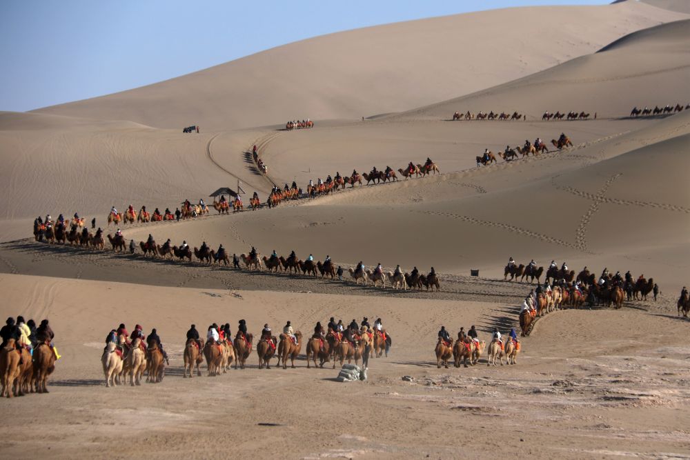 2024年春节迎来“8+1”假期,民众出游热情高涨,各地景区景点迎来参观热潮,文旅市场实现“开门红”。这是游客在甘肃省敦煌市鸣沙山月牙泉景区游览(2024年2月14日摄)。