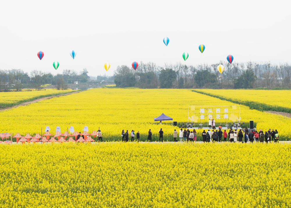 在四川省成都市蒲江县西来镇敦厚社区,游客徜徉在油菜花海里(2024年3月8日摄,无人机照片)。