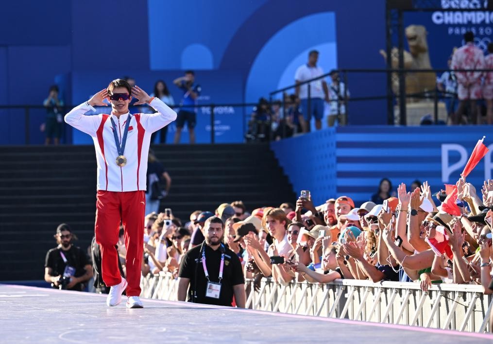 巴黎奥运会跳水男子双人三米板金牌得主、中国选手龙道一在法国巴黎冠军公园与观众互动(2024年8月5日摄)。新华社记者 贺灿铃 摄