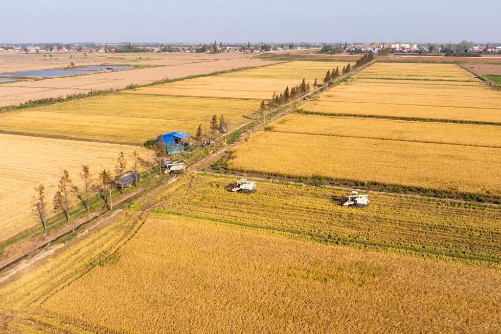 在湖南省岳阳市华容县团洲垸,村民驾驶收割机收获水稻(2024年11月1日摄,无人机照片)。新华社记者 陈思汗 摄