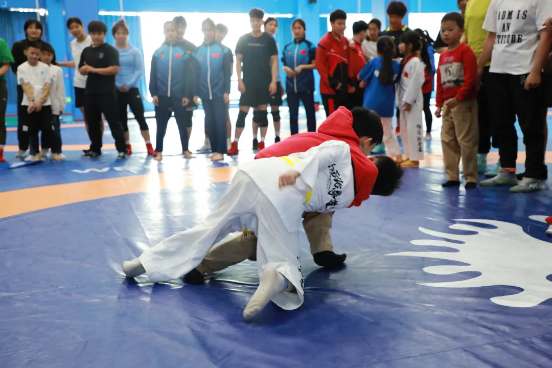 活动现场热闹非凡,大家依次来到射箭、摔跤、攀岩等训练场地观看。射箭运动员身姿挺拔,拉弓射箭动作连贯,箭飞速射向靶心;摔跤选手两两对抗,招式变换间尽显力量与技巧;攀岩队员则如敏捷的飞鸟,在高耸的岩壁上灵活攀爬。教练们耐心地为大家讲解各项目规则,从射箭的发力技巧、摔跤的得分判定,到攀岩的线路规划与计分方式。在教练的指导与工作人员的保护下,大家纷纷参与体验摔跤动作、攀爬岩壁。