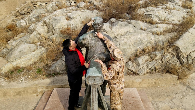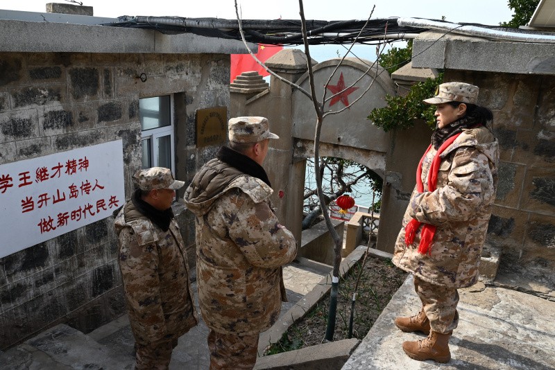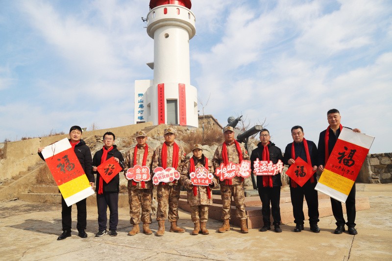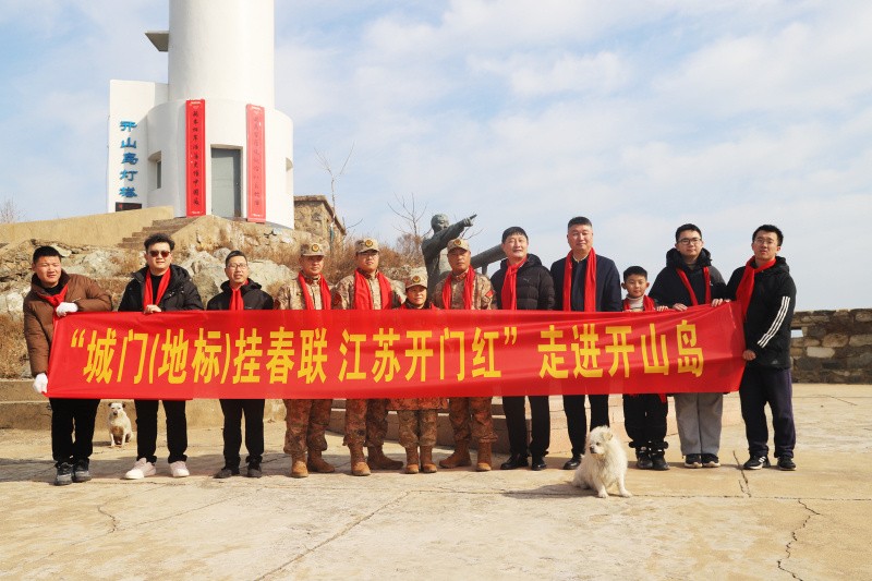 小岛哨所前,海风轻拂,时代楷模王仕花、中国江苏网编委苗润兴、灌云县文联副主席张永丰、连云港市海州区志愿服务联合会会长范伟以及守岛民兵代表,在众人期待的目光中,共同揭开了2025年开山岛的新春春联——“巡岛留痕,蜿蜒恰似长蛇阵;听春拍岸,浩荡更扬中国威。”