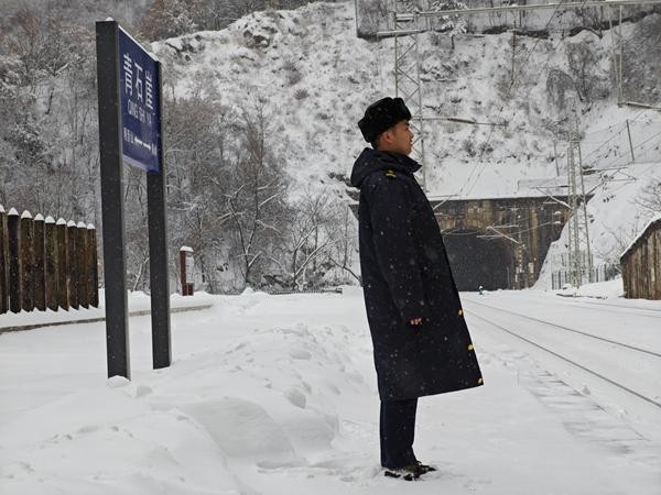 1月25日,青石崖站值班员陈刘虎在室外接车。董海嵘 摄