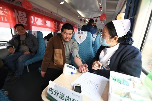 1月23日,中国铁路武汉局集团有限公司组织专家医生在6025次公益慢火车上为旅客义诊。彭琦 摄