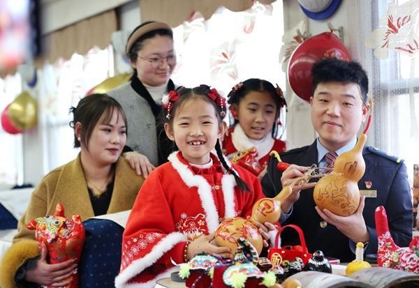 1月20日,K4060次列车上,葫芦烙铁画爱好者郑州客运段列车长唐世林(右一)向小朋友展示传统葫芦烙铁画技艺。鲍鑫 张强 摄影报道