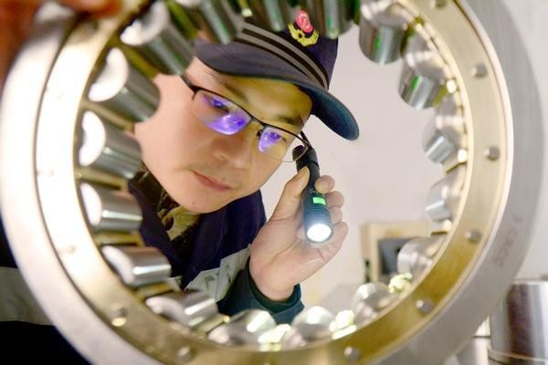 1月20日,株洲机务段株洲检修车间电力机车钳工陈鹏在对机车轴承进行安装前的检查。杜勇勇 摄