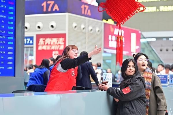 1月22日,郑州东站,留学生在春运志愿服务中。王玮 摄