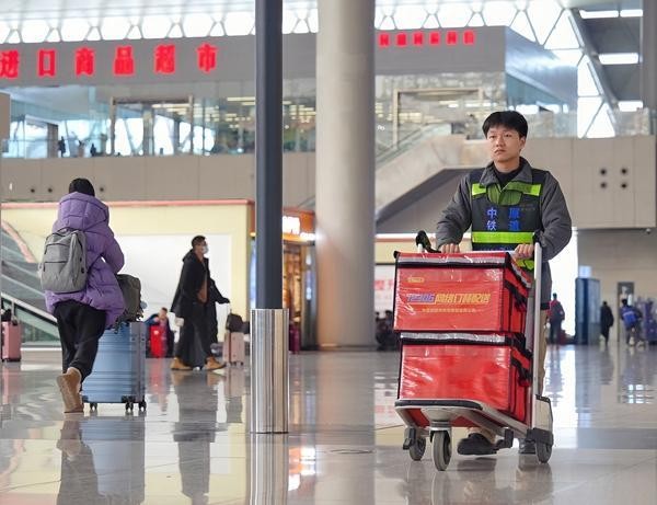 1月24日,郑州东站候车大厅,12306配送员张焱在赶路送餐。曹源 摄