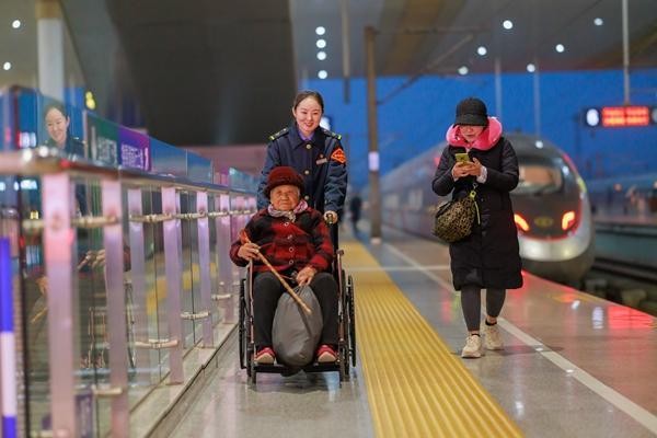 1月24日,南京南站“158”雷锋服务站客运值班员吴晓娟协助重点旅客出行。李忱 摄