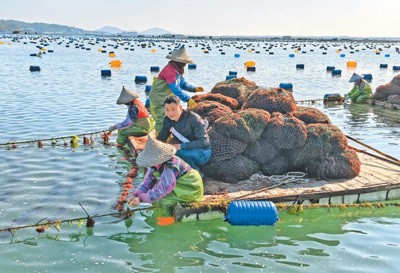 头戴防风斗笠、身穿防水服,几名村民站在浮排上,一条条挂满龙须菜的粗绳被拉上浮排,堆成快一人高的小山。