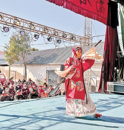 台下一阵鞭炮响,台上一通锣鼓声。正月初八上午9时,戏台帷幕缓缓拉开。河南许昌鄢陵县豫剧团的演员们依次入场,唱、念、做、打样样娴熟,将豫剧《五世请缨》呈现在村民面前。