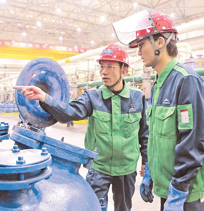 潘从明(左)在指导班组成员操作设备。人民日报记者 赵帅杰 摄