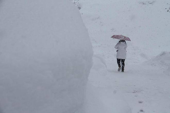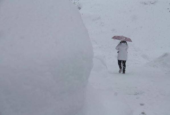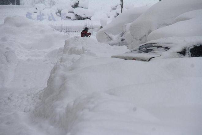 2023年12月22日,山东威海,积雪厚度超过70厘米,市民出行艰难。