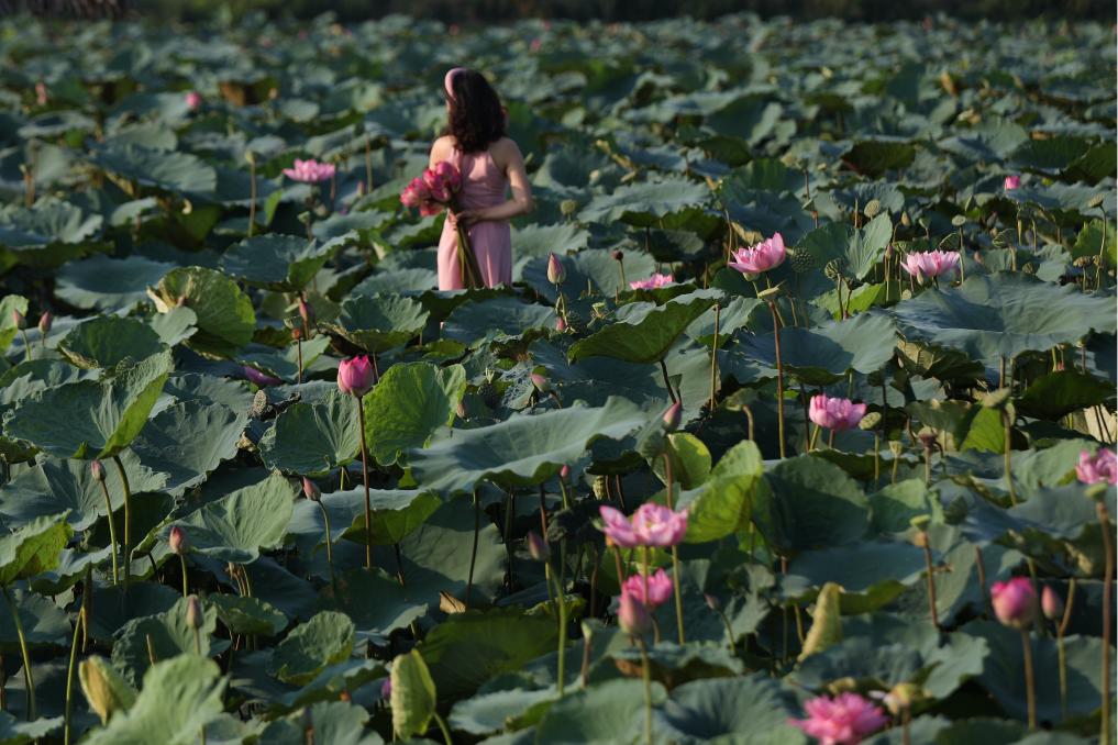 这是2020年7月15日,一名女子在越南首都河内西湖畔的荷花丛中留影。