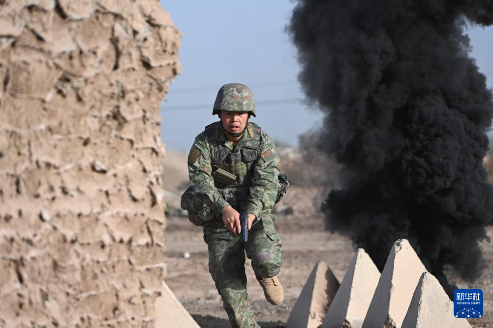 在连战术协同演练中,新疆军区某合成团连长郭强平越过障碍区(2024年9月29日摄)。新华社记者 张永进 摄
