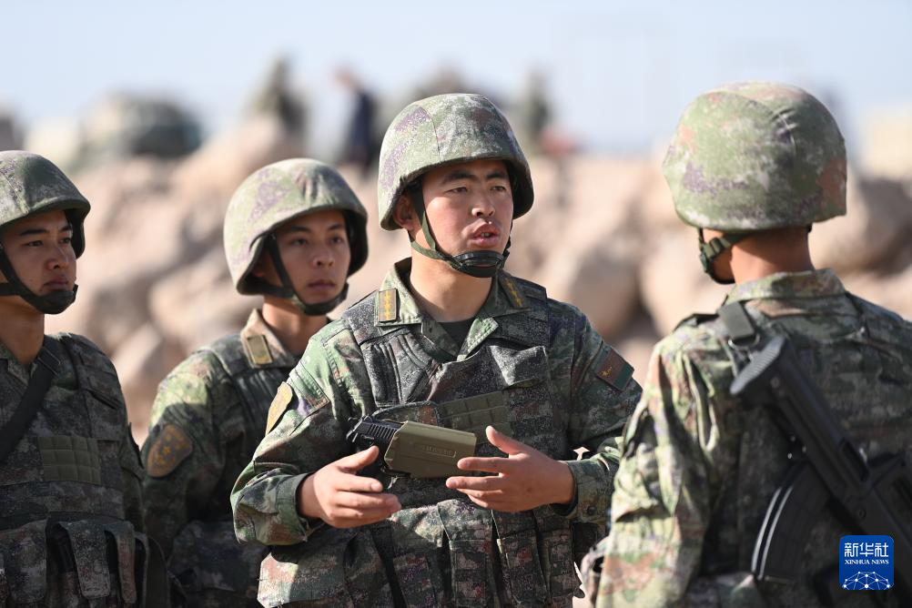 新疆军区某合成团连长郭强平(中)利用训练间隙进行“一对一”教学示范(2024年9月29日摄)。新华社记者 张永进 摄