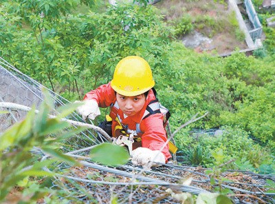 有多难?由于地质条件特殊,不同于一般的骨架式防护,黄杜岩隧道外裹了一层柔性主动防护网。网面柔软,缺乏支撑点。作业时,王俊只能靠手攀住防护网上的钢丝圈,身体紧贴峭壁,才能勉强维持平衡。