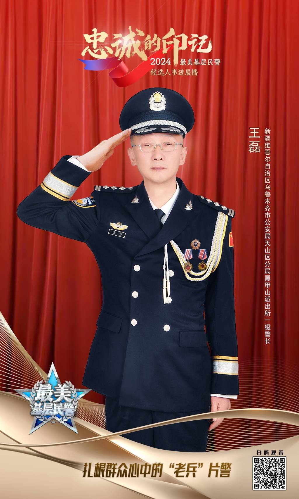 王磊,男,汉族,河南辉县人,1973年5月出生,中共党员,在职大学学历,2006年11月参加公安工作,现任新疆维吾尔自治区乌鲁木齐市公安局天山区分局黑甲山派出所一级警长。