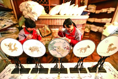 山东青岛市即墨区,工艺品企业员工在制作花边产品。新华社发