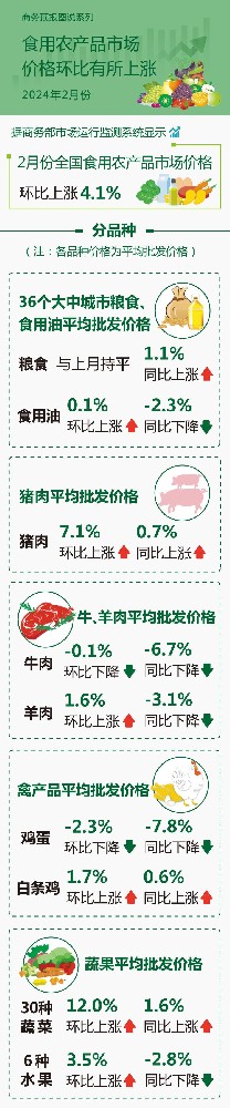 据商务部市场运行监测系统显示,2月份全国食用农产品市场价格环比上涨4.1%。